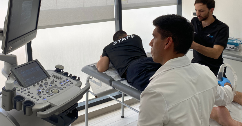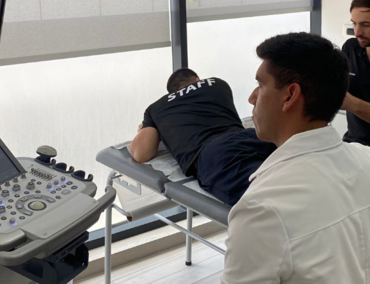 Para complementar el examen físico, utilizamos ecografía en tiempo real, lo que nos permite observar directamente los tejidos afectados. Esto es algo único en Chile, donde somos pioneros en implementar este equipo en casi todas nuestras primeras consultas.*